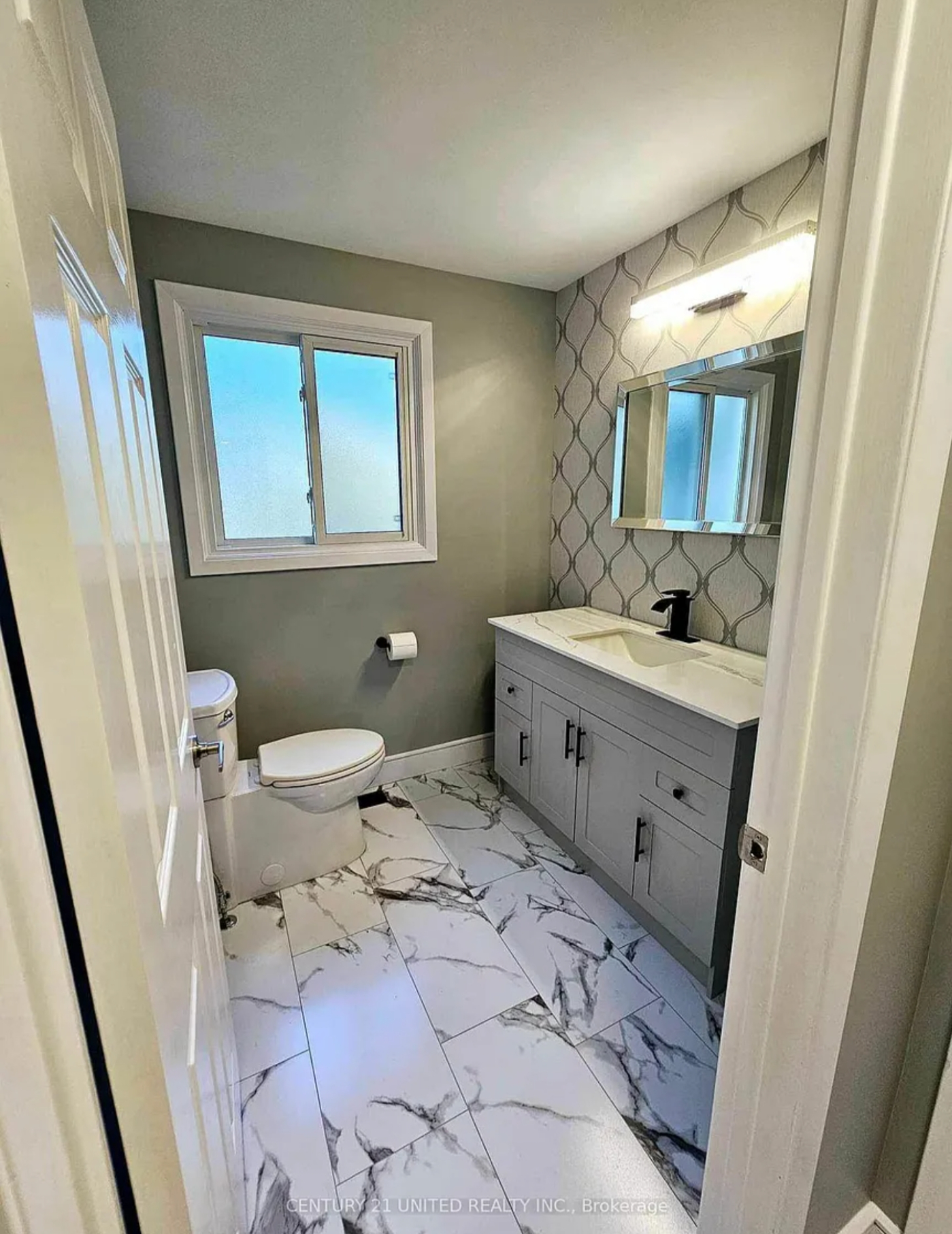 nice fresh remodel with wallpaper, paint, vanity, fixtures, toilet, flooring, and trim UNDER $5000!