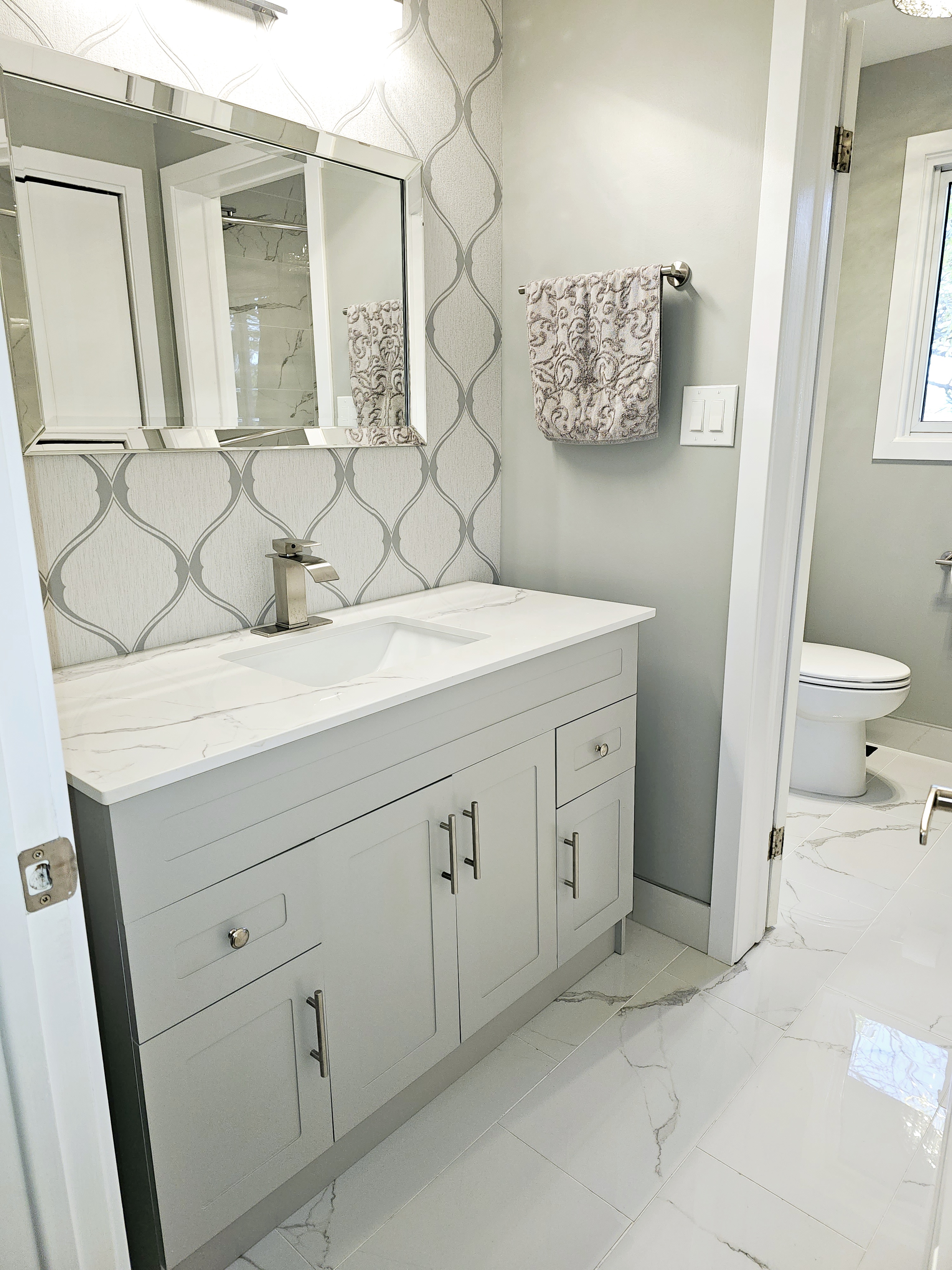 Beautiful bathroom transformation. New tile and heated flooring, New vanity, Toilet, Fixtures, wallpaper, and paint!