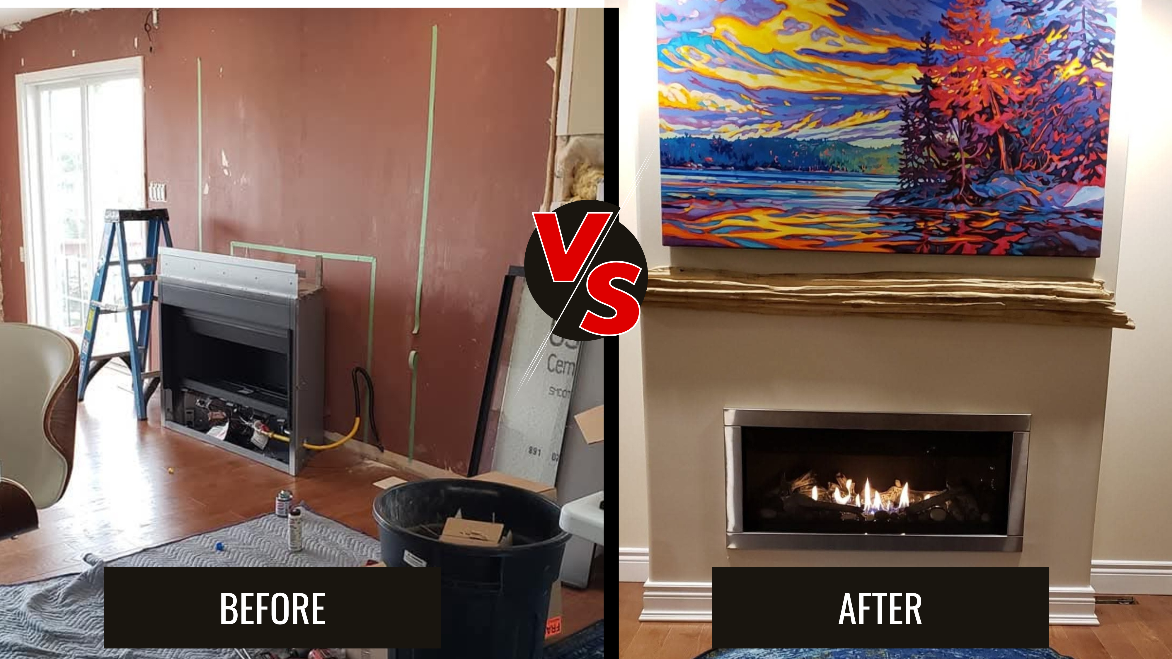 Newly built gas fireplace insert to set the mood, with simple clean lines and a picture with explosive colour, it makes a statement!
